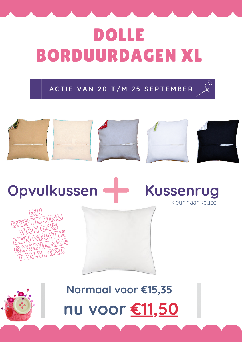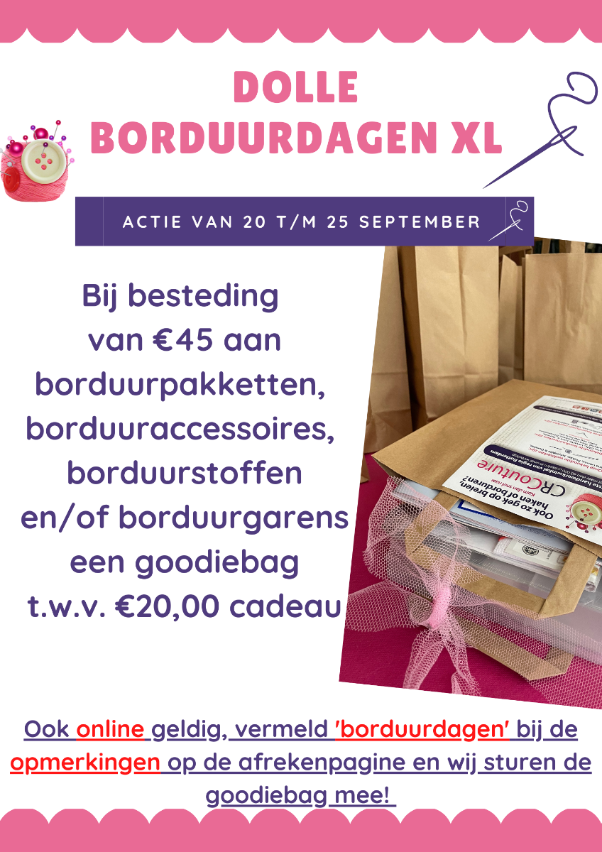 Shopt u voor €45,00 aan borduurpakketten, borduurgarens, borduurstoffen of borduuraccessoires? Dan ontvangt u een goed gevulde goodiebag t.w.v. €20,00 cadeau.