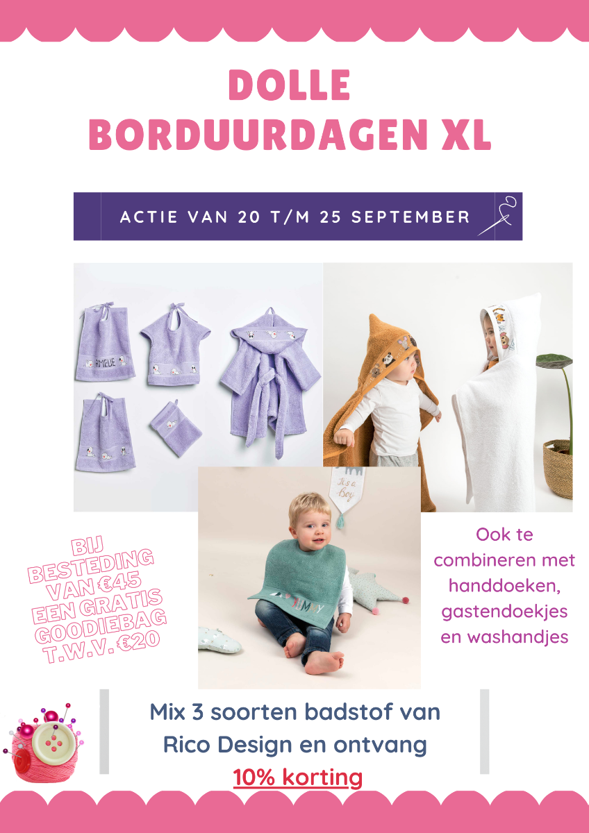Shop 3 badstof items van Rico Design en ontvang 10% korting. Alles mag gemixt worden zoals washandjes, gastendoekjes, slabbetjes, handdoeken, babycapes en baby badjassen. Als het meer 3 stuks of meer is.