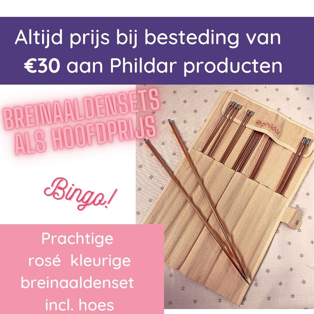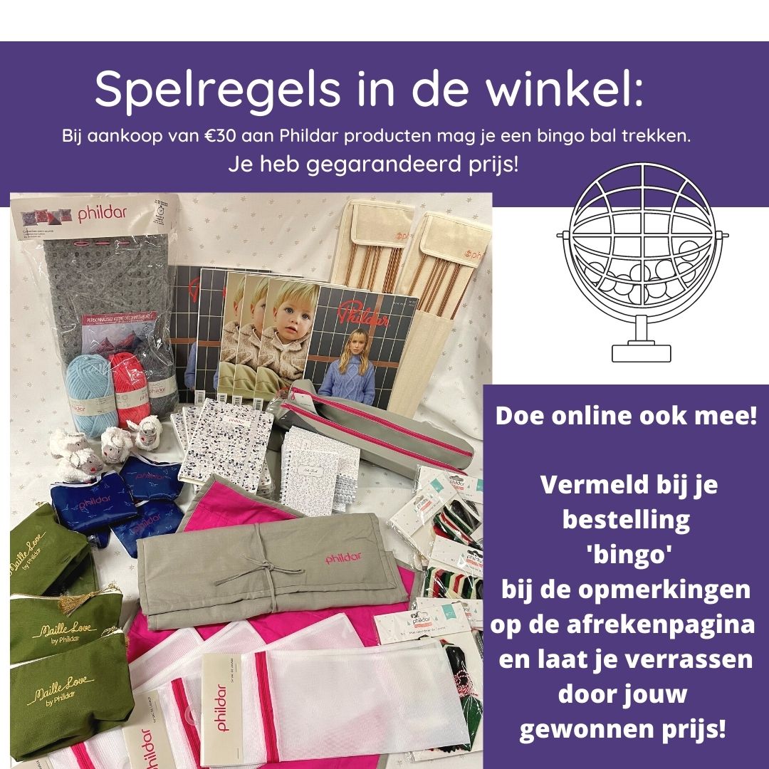 Shop je deze dagen voor €30 aan Phildar producten? Dan doe je mee aan de bingo en maak je kans op toffe prijzen. In de winkel mag je zelf aan het bingo rad draaien als voor €30 aan Phildar heb besteed. Maar online kan je ook mee doen. Hoe? Bestel voor €30 aan Phildar producten en vermeld bij de opmerkingen 'bingo' op de afrekenpagina en wij draaien aan het rad voor jou!