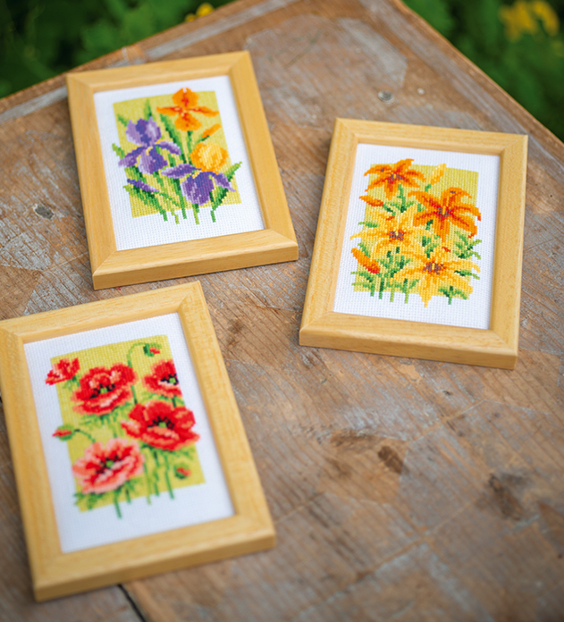 Deze 3 mini Vervaco borduurwerken zijn geborduurd in kruissteek met telpatroon, aida borduurstof, DMC borduurgaren, telpatroon, borduurnaald en werkwijze.