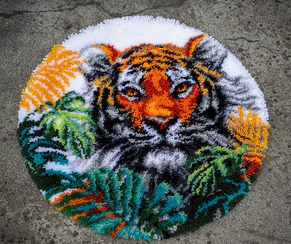Tot slot, dit prachtige knoopkleed… Tijger met junglebladeren.
