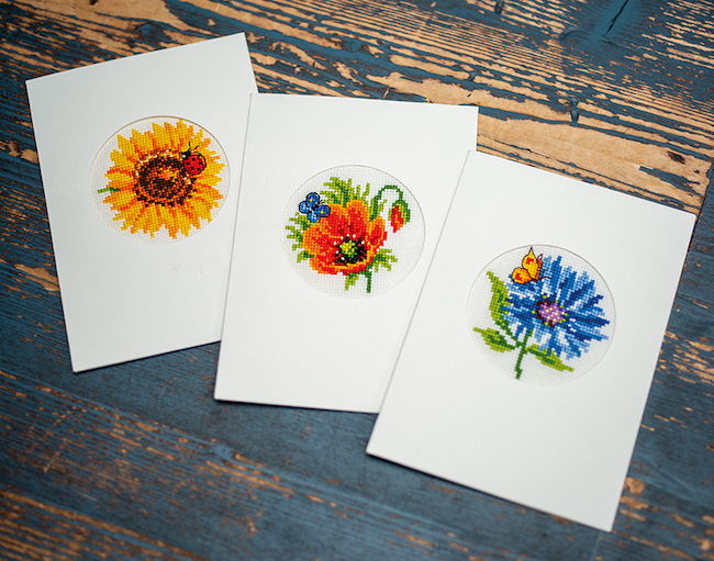 De Vervaco wenskaarten zijn geborduurd in kruissteek met telpatroon, aida borduurstof, DMC borduurgaren, telpatroon, borduurnaald en werkwijze.
